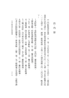 六門教授習定論題解 修定之果:如說修學,即得世出世間勝果,有一頌,屬得果圓滿。 三種定成就:指有尋有伺等三種定,有九頌,屬修習圓滿。 三種圓滿:即具備師資、所緣、作意圓滿,有三頌,屬正依圓滿。 心住一境:於諸所緣,心無動亂,有十六頌,屬本依圓滿。 積集資糧:即修集解脫資糧,有二頌,屬依處圓滿。 求解脫人:係解脫煩惱障及所知障,有四頌,屬意樂圓滿。