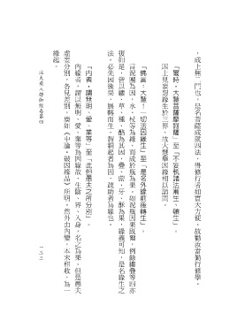 內緣者,謂以無明、愛、業等為因緣故,生陰、界、入身,名之為果。但是愚夫 「內者,謂無明、愛、業等」至「此但愚夫之所分別」。 言泥團為因,水、杖等為緣,而成於瓶為果。如泥瓶因果既爾,例餘縷疊等四亦 「佛言:大慧!一切法因緣生」至「是名外緣前後轉生」。 因上見妄想緣生於三界,故大慧舉因緣相以請問。 「爾時,大慧菩薩摩訶薩」至「不妄執諸法漸生、頓生」。