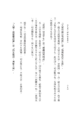 「大慧!菩薩摩訶薩」至「而生驚恐,遠離大乘」。 六、相望准例破。言如不生既爾,一切法無自性,不應立宗,亦復如是。 如不生,一切法空無自性亦如是。 五、立宗多過破。是故若立一切法不生宗,即自壞不生義也。結勸不應如是立宗 「是故一切法不生」至「展轉因異相故」。 四、假五分成墮有無破。又彼立不生宗,要假因、喻、合、結五分而成,故不應 「又彼宗諸分而成故」至「有無相亦不生故」。