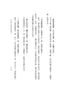 此言「無明與愛業」者,於十二有支因緣中略舉其三也。若具言之,即無明緣行 「一切諸世間,無非是鉤鎖」至「此則非教理」。 言無彼剎那生、住、異、滅四相生故,可謂無生,此則名為無生法忍。 「無生則無性,體性如虛空」至「是則無生忍」。 此末一偈是牒外道救立生法是先有,要待因緣生。譬如暗中物是先有,要待燈照 「我說唯鉤鎖,生無故不生」至「別有於諸法」。 凡夫不能了諸妄緣,是故長劫為之鉤鎖,連環不斷,故目因緣名鉤鎖也。若離妄 「唯除眾緣會,於中見生滅」至「生義不可得」。