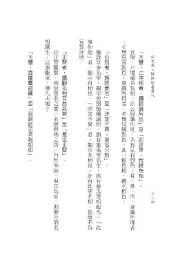 「大慧!菩薩摩訶薩」至「我說此法名為如如」。 以正智觀察,物無當名之實,名無得物之功,自性本無,俱互為客,則無分別名 「正智者,謂觀名相互為其客」至「是名正智」。 施設眾多名字,顯示差別種種諸相,謂有象馬等名生,即有象馬等相起也。「此 「分別者,施設眾名」至「決定不異,是名分別」。 五根、六境通名為相。亦云眼識所見,名有見有對色;耳、鼻、舌、身識所得者 「大慧!此中相者,謂眼識所見」至「如是等,我說為相」。
