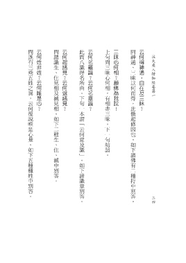 問既有三乘五姓之異,云何復說唯是心量。如下五種種姓中別答。 云何姓非姓?云何唯是心? 問諸識生、住見相及滅見相。如下二種生、住、滅中別答。 云何起諸見?云何退諸見? 此問八識得名所由。下句一本謂「云何意及識」。如下諸識章別答。 云何名藏識?云何名意識? 上句問三昧心何相,有相非三昧。下一句結請。 三昧心何相?願佛為我說! 問神通、三昧以何而得,此徵起修因也。如下諸佛有二種持中別答。 云何得神通,自在及三昧? 注大乘入楞伽經卷第一 3 4 4