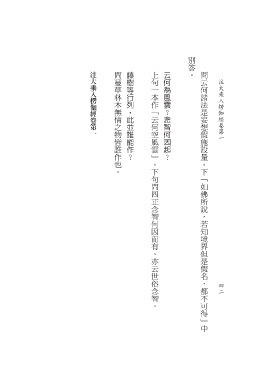 別答。 注大乘入楞伽經卷第一 問蔓草林木無情之物皆誰作也。 藤樹等行列,此並誰能作? 上句一本作「云何空風雲」。下句問四正念智何因而有。亦云世俗念智。 云何為風雲?念智何因起? 問云何諸法是妄想假施設量。下「如佛所說,若知境界但是假名,都不可得」中 注大乘入楞伽經卷第一 4 2 2
