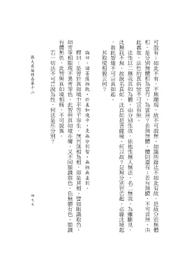 有體無色,此智與真如境相稱,不可說異。 如青等相顯現不異青等色,此智與真如境亦爾。又不同眼識與色,色無體有色,眼識 ,故此智緣不可言真如起。 此無我不無,故說名真如。此真如是菩薩境。何以故?是無分別智若起,必緣此境起 此義故,法性約真俗皆不可言有無。 相。是分別無體相為當有,為當無?若無無體,體則還有;若有無體,不可言無。由 可說有;如此不有,不無顯現,故不可說無。如識所緣法不如此有故,是故分別無體