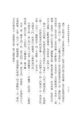 次有二頌,總有九門:初一頌有四門,第二頌有五門。初頌第一、法施設中云「 次頌有五門,第五門中云 次頌有六門,初加行中無佛者,以佛無加行故。 論云「由五因緣,於諸有情能作不虛加行」等者中,乃至「應知其相」,此領解 初頌有七門中,第二、「五種不希奇法,而名成就甚希奇法」者,據相而論,人 義曰:前明菩提,宗是因果覺分行,此等以前行時必有所據,故次品後明功德品。