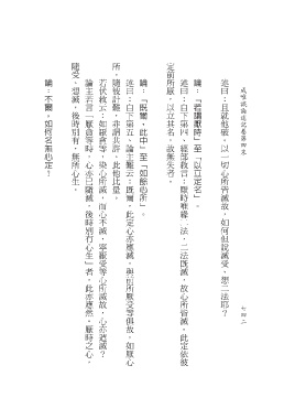 論:不爾,如何名無心定? 論主若言「厭貪等時,心亦已隨滅,後時別有心生」者,此亦應然。厭時之心, 若伏救云:如厭貪等,染心所滅,而心不滅,寧厭受等心所滅故,心亦遣滅? 述曰:自下第五、論主難云:既爾,此定心亦應滅,與前所厭受等俱故,如厭心 論:「既爾,此中」至「如餘心所」。 述曰:自下第四、經部救言:厭時唯緣二法,二法既滅,故心所皆滅。此定依彼 論:「若謂厭時」至「以立定名」。 述曰:且就他破。以一切心所皆滅故,如何但說滅受、想二法耶?