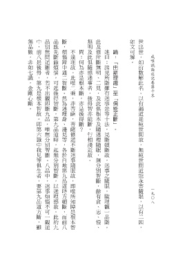 無品數,非如七識,金剛心斷。 中,前八是後得,第九是根本智故。即第六識中我見等俱生者,要第九品道方斷,雖 品別無間道斷者,若不出觀即斷九品,唯無分別智斷。八品中,迷事煩惱不可一觀道 品既先斷餘煩惱,可起後得智斷,第九品道時,起無分別智斷,以迷理惑故。此約九 斷,煩惱障中通二智斷。然為迷理身、邊見等,各於自地第九品道時方頓斷,而前八 無明及此俱隨惑迷事者,後得智亦能斷,行相淺近故。 此及修所斷無明、二見,及此俱根本及隨迷理隨眠,無分別智斷,餘有貪、恚、慢、 如文可解。 世出世,如前數解此名。以有漏道是純世間故,無純世間道能永害隨眠,以有二因,