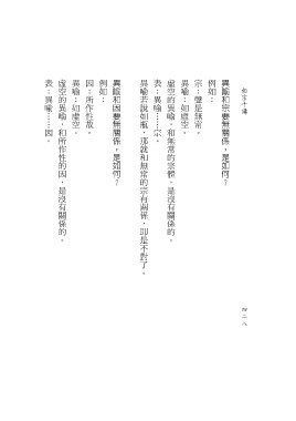表:異喻……因。 虛空的異喻,和所作性的因,是沒有關係的。 異喻:如虛空。 因:所作性故。 例如: 異喻和因要無關係,是如何? 異喻若說如瓶,那就和無常的宗有關係,即是不對了。 表:異喻……宗。 虛空的異喻,和無常的宗體,是沒有關係的。 異喻:如虛空。 宗:聲是無常。 例如: 異喻和宗要無關係,是如何? 相宗十講 4 2 2 8 8