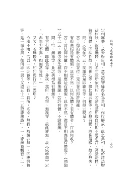 今謂不爾,若言「即此色等,非我、我所,名空、無我,故說非無」,即應與色 又云:若無體者,如何與行非一異耶? 有言有體,即此色等,非我、我所,名空、無我等,故此非無。故《成唯識》云 問:空、無我等,此之共相為有體無? 答:言法同分攝,許不相應是有體假。此亦不然,誰言不相應是有體假?《瑜伽 有說共相是有體假,此定不然,以何為體?若有體者,百法何收? 答:彼約散心未自在位,定自在位即許現緣。 問:《瑜伽》云,聞謂比量即緣名等,何得云現量?