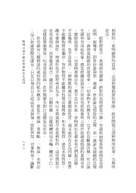 。這八俗諦實際是虛妄,只足以增長吾人底成見或我慢,致對世間一切事物妄下論斷 這樣底現象便是一切迷妄底原因,而世間實在即由這種妄見而有。 在也是如此,因眾緣底和合,緣因於因,因賴於緣,因緣相續如汲水輪,轉流不已。 離水便無濕性,無濕性也不能理會其為水,所以水與濕底存在是相對的。這世間底存 不能離物質而獨存,等於物質不能離其性質而被理會。如水是物質,濕是水底性質, 不是偶然,也不是徒然。一種物質和寓在它裏頭底性質,兩者底存在互為因緣。性質 。實際說起來,一切事物都無自性,都不是自生底。事物底出生都各有它們底因緣, 生滅和有無底現象,都是根據從我等日常知見底假象所立底世俗諦或假設的真理而來 。從第一義諦或超絕的真理看來,一切事物不