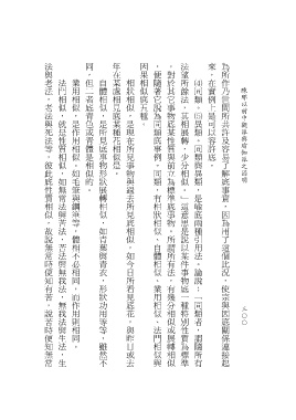 法門相似,就是性質相似,如無常法與苦法,苦法與無我法,無我法與生法,生 業用相似,是作用相似。如毛筆與鋼筆等,體相不必相同,而作用則相同。 自體相似,是所見底事物形狀展轉相似,如青葉與青衣,形狀功用等等,雖然不 相狀相似,是現在所見事物與過去所見底相似,如今日所看見底花,與昨日或去