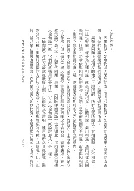 教三量乃是在量裏應當說底,它們是間接的知見比度,不是直接的論式。所成立與能 然分為八種,但屬於直接的方面只有宗因喻,合同類與異類為五種,其餘現、比、正 《瑜伽論》底,它們既然採用五分作法,可見《瑜伽論》底論證形式也是一樣。 雜集論》裏以合、結替代同類、異類,《阿毗達磨集論》也是如此,這兩部論是根據 三支作法,但《倫記》與《略纂》等書底註釋都解因喻之中含有合、結在裏頭。在《 ,則所立底宗義能得成就,這一點就是因喻對於所立之宗便是能立底意思。 果相違。同類,是喻依與因相似的事物;異類,是喻依與因完全相違。故喻與因相類 」這也與前一樣分為五種相違,就是相狀相違、自體相違、業用相違、法門相違及因 果,由是推知諸樂果皆為善因所成,諸苦