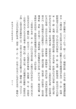 手釧、足環及身莊嚴妙好之具,若彼天男及天女等思莊嚴具者,纔起心時,而自至手。 ,若彼天男及天女等思音樂者,纔起心時,其樂自鳴。又有種種妙莊嚴樹,彼樹所出 女等思其衣者,纔起心時,而自至手。又有種種妙音樂樹,所謂簫、笛、琴、箜篌等 果樹林亦復如是。彼樹復有種種飛鳥遊止其上,出妙音聲。 種華樹、果樹,直生端立,圓無缺減,如結鬘師取以妙線,妙巧安布,盤結成鬘,華 覆其內,復有種種水鳥遊戲池中,出妙音聲,謂高遠聲、悅意聲、美妙聲等。復有種 柱及以梁棟。清涼甘美水滿池中,優鉢羅華、鉢訥摩華、俱母陀華、奔拏利迦華等遍 即金為柱及以梁棟;若琉璃為臺,即頗胝迦為柱及以梁棟;若頗胝迦為臺,即琉璃為 臺,