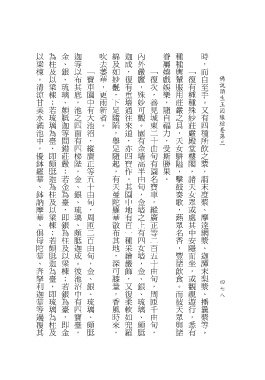 以梁棟。清涼甘美水滿池中,優鉢羅華、鉢訥摩華、俱母陀華、奔拏利迦華等遍覆其 為柱及以梁棟;若琉璃為臺,即頗胝迦為柱及以梁棟;若頗胝迦為臺,即琉璃為柱及 金、銀、琉璃、頗胝迦等間錯莊嚴:若金為臺,即銀為柱及以梁棟;若銀為臺,即金 迦等以布其底,池之四面有四梯陛,金、銀、琉璃、頗胝迦成。彼池沼中有四寶臺, 吹去萎華,更雨新者。 綿及如妙 迦成,復有重墻通往來道,亦四寶作。其園中地有百一種采繪嚴飾,又復柔軟如兜羅 內外嚴麗,殊妙可觀。園有金墻高半由旬,金墻之上有四女墻,金、銀、琉璃、頗胝 眷屬嬉戲娛樂,隨自福力,受斯勝果。 種種輿輦服用莊嚴之具,天女駢隘,擊鼓奏歌,爇眾名香,豐諸飲食。而彼天眾與諸 時,而自
