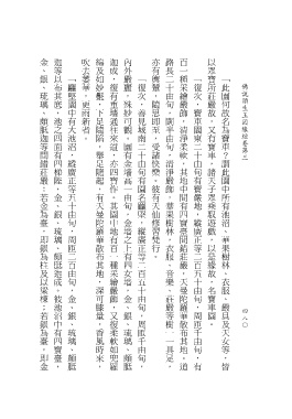 金、銀、琉璃、頗胝迦等間錯莊嚴:若金為臺,即銀為柱及以梁棟;若銀為臺,即金 迦等以布其底,池之四面有四梯陛,金、銀、琉璃、頗胝迦成。彼池沼中有四寶臺, 吹去萎華,更雨新者。 綿及如妙 迦成,復有重墻通往來道,亦四寶作。其園中地有百一種采繪嚴飾,又復柔軟如兜羅 內外嚴麗,殊妙可觀。園有金墻高一由旬,金墻之上有四女墻,金、銀、琉璃、頗胝 亦有輿輦,隨思即至,受諸快樂。彼有天仙修習梵行。 路長二十由旬,闊半由旬,清淨嚴飾,華果樹林,衣服、音樂、莊嚴等樹一一具足, 百一種采繪嚴飾,清淨柔軟,其地中間有四寶臺間錯莊嚴,天曼陀羅華散布其地。道 以眾寶所莊嚴故,又有寶車,諸天子眾乘馭遊戲,以是緣故,名寶車園。