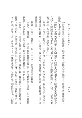 旬,周匝七由旬,高一由旬半。有八千象而為眷屬,身皆白色,如俱母陀花七支拄地 拄地。象王頭相,內赤外青,如帝青色,具有六牙,身長二由旬半,前後平闊各一由 鐍其門,潛伏而住;若天退敗,即入天宮扃鐍其門,潛伏而住。 瞬異於天主。」 與帝釋天主共處其座,大小身相、容止威光、音聲語言及莊嚴具,悉無有別,唯王目 若分半座,命我同坐,豈不快哉!』」 次而入,餘諸侍從各列于外。王乃惟忖:『我今亦應處是座邪?』又念:『帝釋天主 最後安布頂生王座。