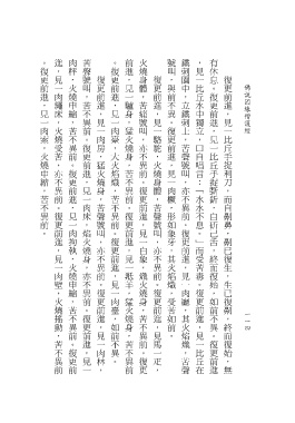 。復更前進,見一肉索,火燒申縮,苦不異前。 進,見一肉繩床,火燒受苦,亦不異前。復更前進,見一肉壁,火燒搖動,苦不異前 肉秤,火燒申縮,苦不異前。復更前進,見一肉拘執,火燒申縮,苦不異前。復更前 苦聲號叫,苦不異前。復更前進,見一肉床,焰火燒身,亦不異前。復更前進,見一 。復更前進,見一肉臺,大火焰熾,苦不異前。復更前進,見一肉臺,如前不異。 前進,見一驢身,猛火燒身,苦不異前。復更前進,見一羝羊,猛火燒身,苦不異前 火燒身體,苦痛號叫,亦不異前。復更前進,見一白象,熾火燒身,苦不異前。復更 號叫,與前不異。復更前進,見一肉橛,形如象牙,其火焰熾,受苦如前。 鐵刺園中,立鐵刺上,苦聲號叫,亦不異前。復更前