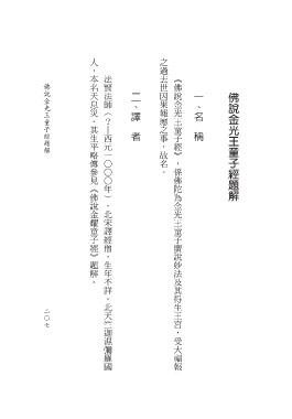 人,本名天息災。其生平略傳參見《佛說金耀童子經》題解。 之過去世因果報應之事,故名。 法賢法師(?|西元一 《佛說金光王童子經》,係佛陀為金光王童子廣說妙法及其得生王宮,受大福報 佛說金光王童子經題解 二、譯 一、名 佛說金光王童子經題解 者 稱 ○○○ 年),北宋譯經僧。生年不詳。北天竺迦濕彌羅國 2 0 0 7 7