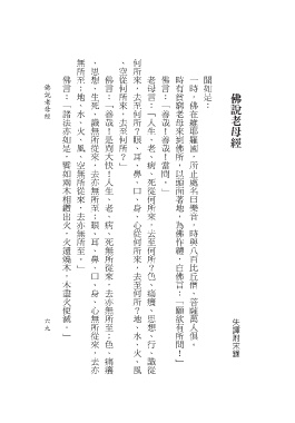 佛言:「諸法亦如是,譬如兩木相鑽出火,火還燒木,木盡火便滅。」 佛言:「善哉!是問大快!人生、老、病、死無所從來,去亦無所至;色、痛癢 老母言:「人生、老、病、死從何所來,去至何所?色、痛癢、思想、行、識從 佛言:「善哉!善哉!當問。」 時有貧窮老母來到佛所,以頭面著地,為佛作禮,白佛言:「願欲有所問!」 一時,佛在維耶羅國,所止處名曰樂音,時與八百比丘僧、菩薩萬人俱。 聞如是: