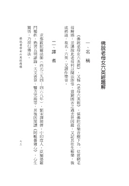 驚悟,乃深信佛法。 門種姓,熟習五明諸論、天文書算、醫方咒術等,其後因閱讀《阿毗曇雜心》,心生 成佛道,故名。六英,又譯作樂音。 母解惑,並講說此老母何以聞法即悟、貧窮困苦之過去世因緣,又記其往生極樂,後 求那跋陀羅法師(西元三九四|四六八年),劉宋譯經僧。中印度人。原屬婆羅 《佛說老母女六英經》,又稱《老母六英經》。係佛陀在樂音樹下為一位貧窮老 佛說老母女六英經題解 二、譯 一、名 佛說老母女六英經題解 者 稱 7 3 3
