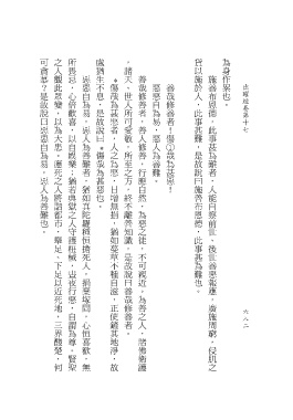 可貪慕?是故說曰惡惡自為易,惡人為善難也。 之人觀此眾變,以為大患。應死之人將詣都市,舉足、下足以近死地,三界酸楚,何 所畏忌,心倍歡喜,以自娛樂;猶若典獄之人守護杻械,晝夜行惡,自謂為尊。賢聖 處猶生不息,是故說曰 ,諸天、世人所可愛敬,所至之方,終不離善知識,是故說曰善哉修善者。 貨以施於人,此事甚難,是故說曰施善布恩德,此事甚為難也。 為身作累也。