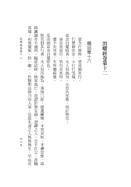 萬端,如彼猨猴,捨一趣一,於賢聖法律乃有大累,是故先達之人教彼後生,卒成其 時諷誦亦不通利,臨欲試時,捨眾逃亡,是謂於學有損。習禪之人,念不在定,流馳 慎莫損其行者,夫人有所施為,事情已彰,復還懈慢,不究其理,不禪思惟,或 是故說當念自覺悟也。 當念自覺悟者,夫人有施為,先當內思惟,校計熟思。 出曜經卷第十二 慮不失所者,失所懷痛憂。 善思而思行,慎勿失其所, 行要修亦安,不行行受報。 當念自覺悟,慎莫損其行, 雜品第十六 出曜經卷第十二 4 6 6 5 5