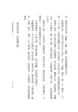 憂也。 毛、爪齒、肥白、端正。行人執意,除去彼念,欲想便息,不復熾然,是故說欲斷無 謂真行。」是故說棄倚行止也。 不反也。 生死,不可稱記,墮三塗八難,是故世尊說:「當滅四淵,求無上道。」是故說度淵 道,三十七品。正使有法離於生死,得出要者,亦名清白法,是故說學唯清白也。 法。諸染著生死者,當斷、已斷、永斷,是故說斷濁黑法也。