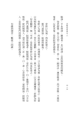 入,是故說根門得開張,結賊得縱逸也。 惟故,使結賊得入,劫善根財貨。耳、鼻、口、身、心亦復如是,意根開張,結賊得 ,智者觀察,無一可貪,是故說骨幹以為城,肉血而塗之。 以內物現露於外者,便生惡露觀,不染著身,興不可樂想。以其皮膚覆骨,莊飾為形 惟者,反更思惟,是故說染者謂愚也。 眼淨,不永得淨。羅漢者,永已得淨,是故說無染則離也。