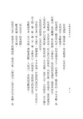 從是住定者,彼智定人收攝諸根,執意不亂,心無他念,心所念法亦不流馳,是 是斷諸苦者,有中有餘,無餘盡能斷,入泥洹中,是故說是斷諸苦。 忍和意定者,學人進行,調御諸根,不令放逸,於諸根門悉得自在,忍力具足, 信戒精進,定法要具者,比丘執行亦如彼馬,內恒思惟,恐有過失,復恐諸梵行 如馬調耎,隨意所如者,如有善調馬之士,以策御馬,隨意所如,不失本轍,馬