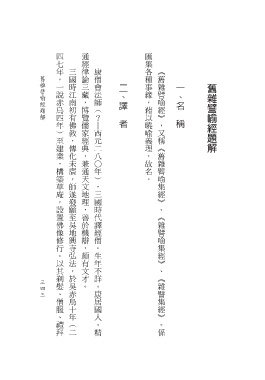 四七年,一說赤烏四年)至建業,構築草庵,設置佛像修行。以其剃髮、僧服、禮拜 通經律論三藏,博覽儒家經典,兼通天文地理,善於機辯,頗有文才。 匯集各種事緣,藉以曉喻義理,故名。 三國時江南初有佛教,傳化未廣,師遂發願至吳地興寺弘法,於吳赤烏十年(二 康僧會法師(?|西元二八 《舊雜譬喻經》,又稱《舊雜譬喻集經》、《雜譬喻集經》、《雜譬集經》。係 舊雜譬喻經題解 二、譯 一、名 舊雜譬喻經題解 者 稱 ○ 年),三國時代譯經僧。生年不詳。康居國人。精 3 4 4 3 3