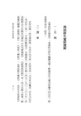 復獨自翻譯《優填王經》、《前世三轉經》、《佛說群牛譬經》、《頂生王故事經》 洛陽與法立法師共同譯出《法句譬喻經》、《諸德福田經》等。法立法師入寂後,師 、帛法巨(炬)。才識出類拔萃,志趣遊化。惠帝年間(西元二九 進修習善法,故名。 法炬法師,西晉譯經僧。生卒年均不詳。氏族未詳,以其來自龜茲,亦名白法巨 《佛說群牛譬經》,係佛陀以群牛驅驢為譬,勸諭諸比丘應當捨離不如法行,精 佛說群牛譬經題解 二、譯 一、名 佛說群牛譬經題解 者 稱 ○ |三 4 8 8 1 ○ 1 六年)於